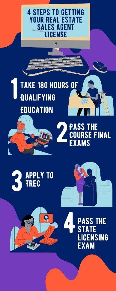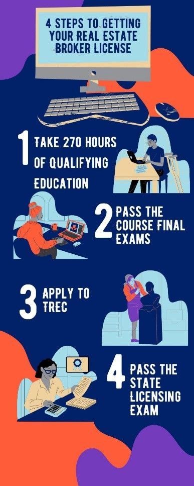 There are a few more wrinkles in the process to get a broker license: you must have been licensed as a sales agent for four years, have at least 360 experience points from real estate transactions, and have completed 630 hours of additional real-estate-related education (which can be done with a bachelor’s degree). If you have all of these and completed 270 hours of qualifying education, you can apply to TREC and take the state broker licensing exam.