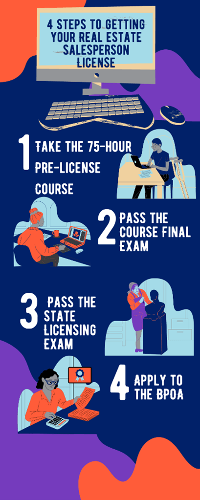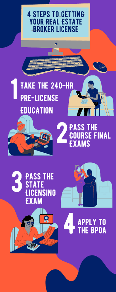 The process to become a broker is virtually the same as a salesperson. You will complete the pre-license education, apply to the BPOA, then pass the state licensing exam. There are 2 slight differences to get your broker license: you must have been licensed as a salesperson for at least 2 years and the broker pre-license education is 240 hours, not 75. The 240 hours comes in multiple courses approved by the Commission, including a mandatory 30-hour broker management course. You also need to be licensed as a salesperson for at least 3 years before you can become a real estate broker.